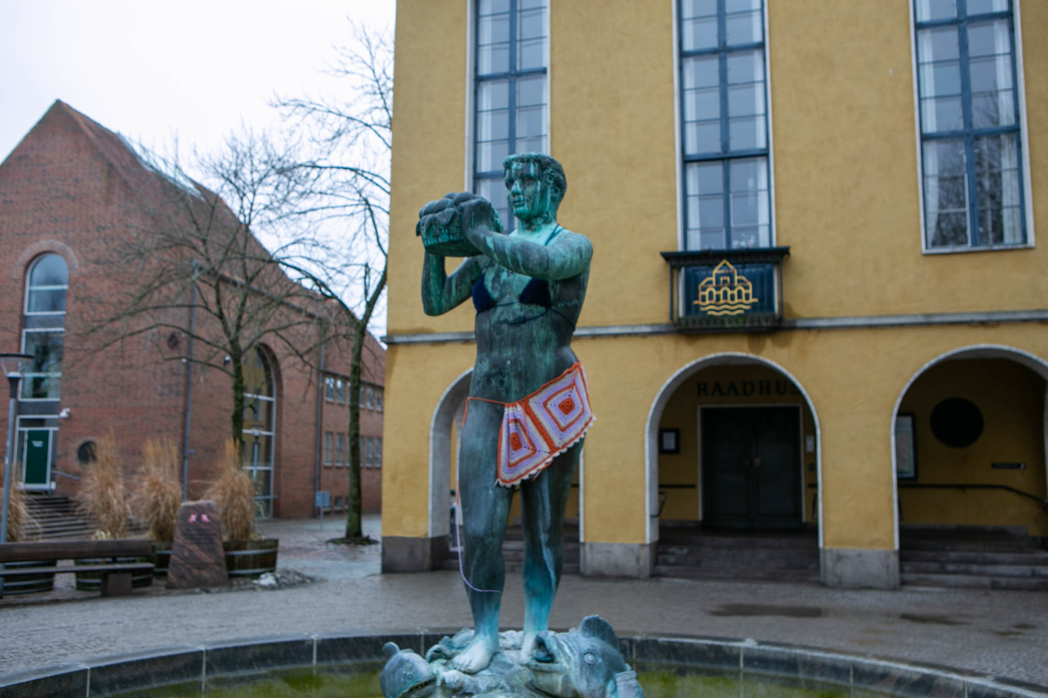 På det seneste er flere statuer af nøgne kvinder i landet blevet klædt på i blød strik og det gælder også Alspigen på Rådhustorvet, hvor de nøgne baller og bryster dækket til.