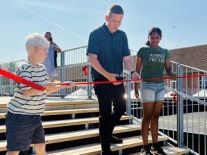 Jesper Smaling, formand for Børne- og Uddannelsesudvalget, holdt åbningstale og sammen med Mads fra 1. klasse og Ciro fra 9. klasse, klippede han ’den røde snor’. Derefter gik alle op ad den nye trappe og op til Isbilen, som ventede på den nye legeplads.