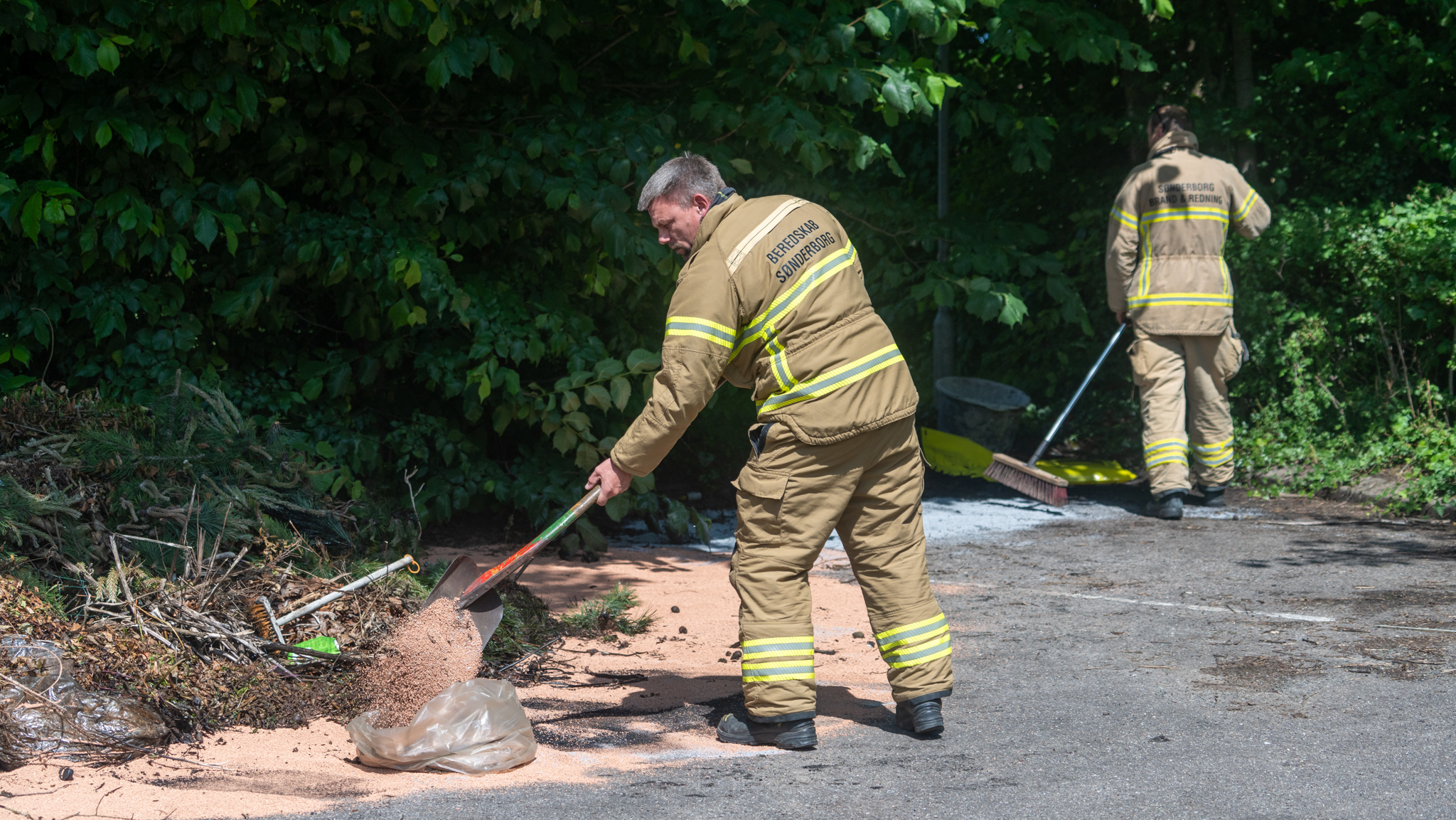 “Det viste sig, der var en, som havde smidt motorolie ud og vi bruger kattegrus, der suger olien, får det over i nogle poser og får det bortskaffet på miljøvenlig vis”, siger indsatsleder René Andersen til Nært & Nyt.