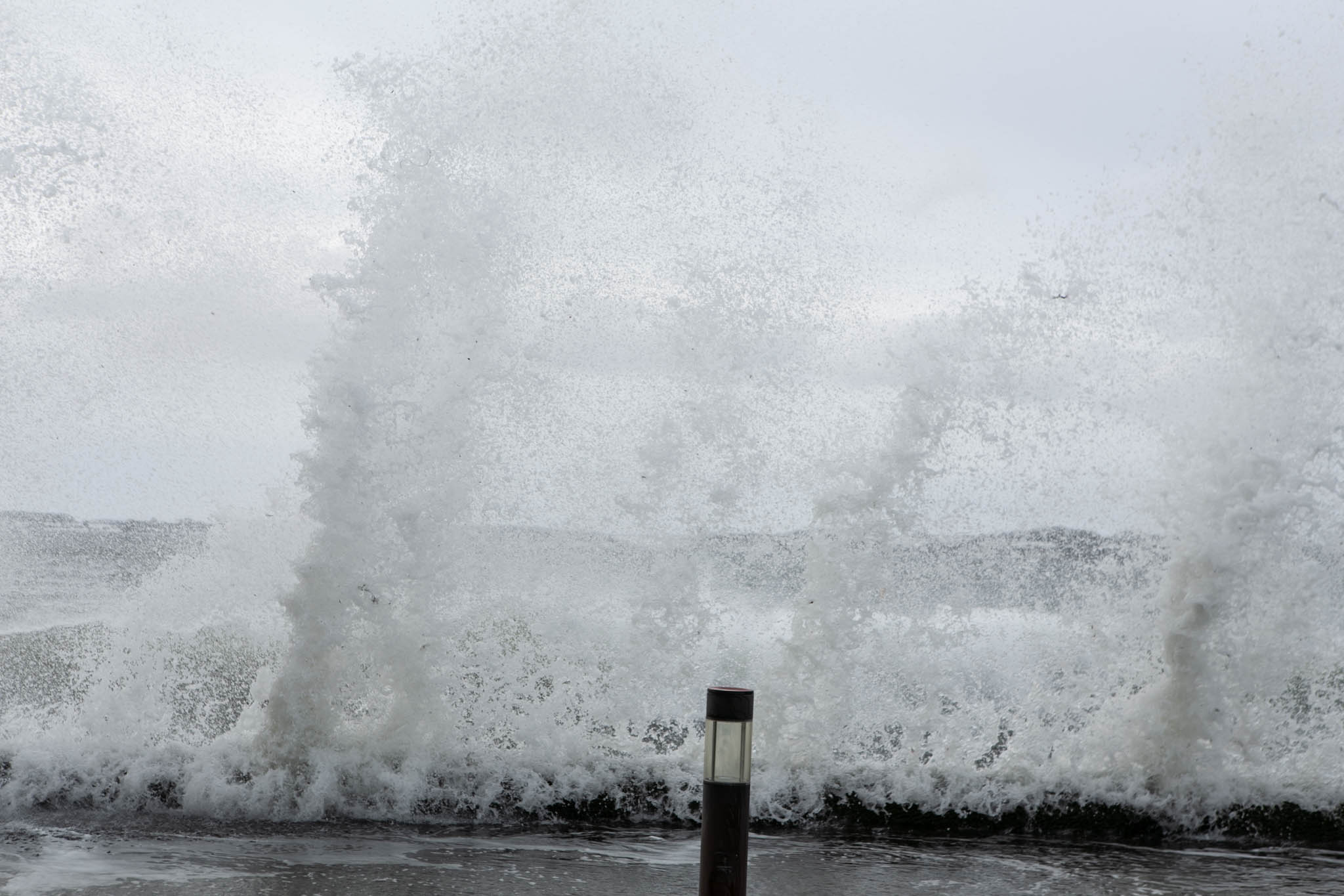 Langs Strandpromenaden slår bølgerne op – og vandstanden er ifølge DMI her klokken 12 på 74 centimer over dagligt vande. Den ventes at stige til 122 centimer ved midnatstid.