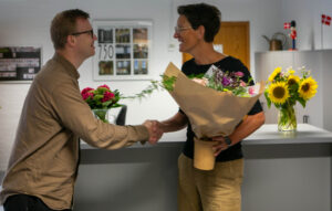 , som gerne vil fremhæve nogle af de kommunalt ansatte, som gør det godt. Og det var en buket, som han selv havde købt i Kobberblomst.