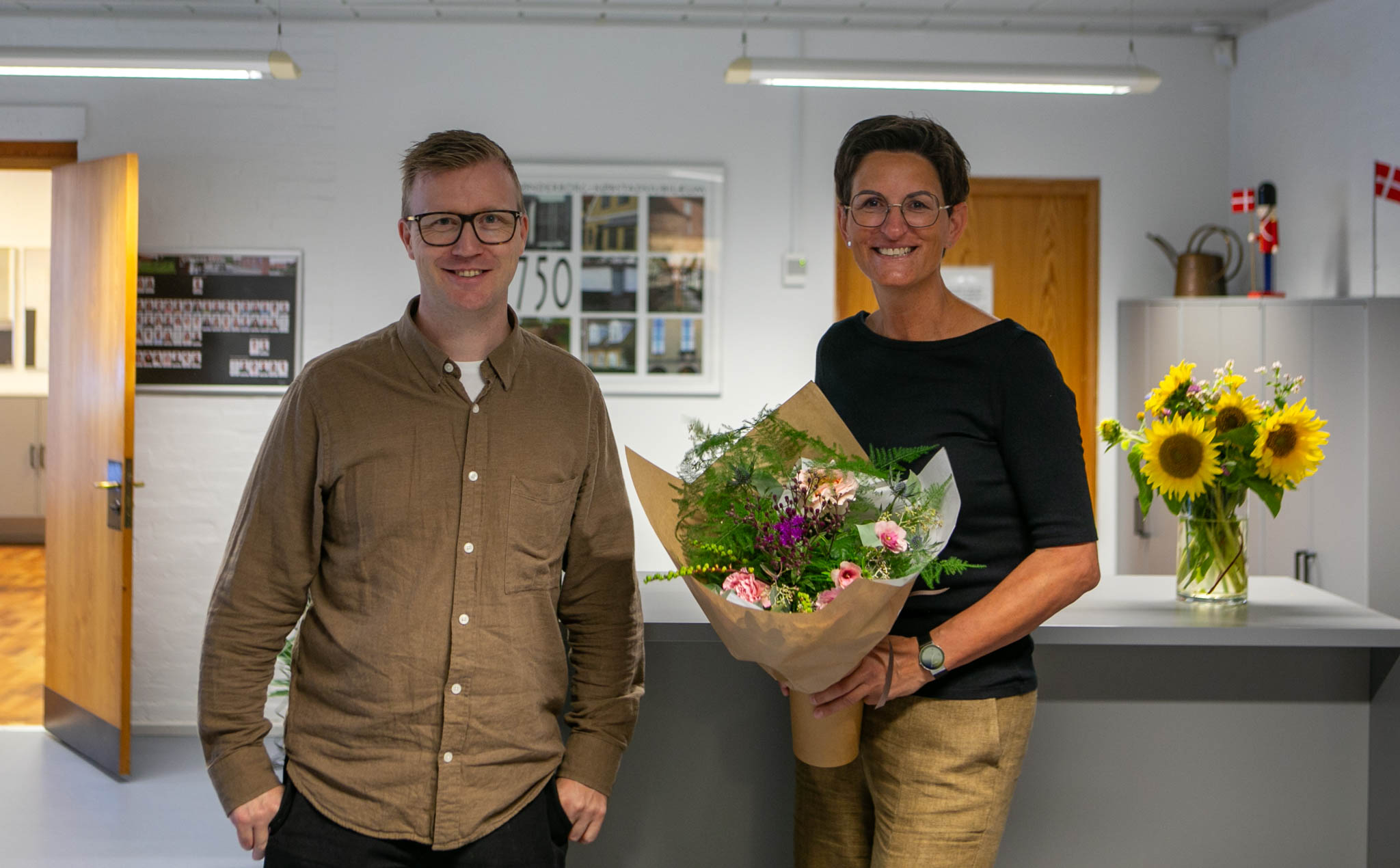 Skoleleder Elin Lei Bergmann fra Ulkebøl Skole fik tirsdag morgen en flot buket af byrådskandidat Jesper Kock fra Socialdemokratiet