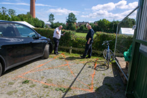 Der er klippet et hak i hækken mellem Hesteskoens telt og der er ‘parkering forbudt’ på græsset ved hakket.