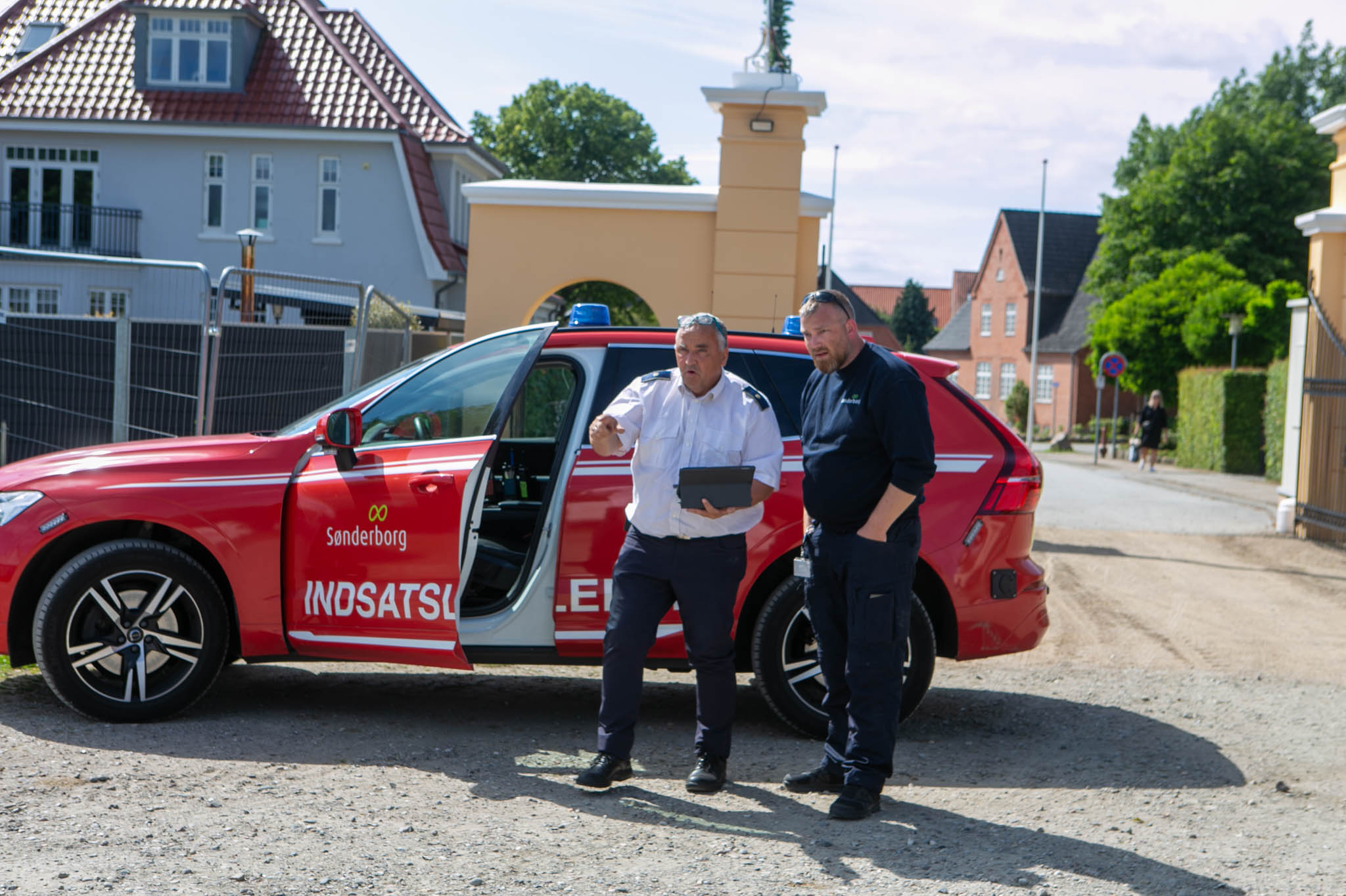 “Hvis der bliver brand i Børneland, så kan vi holde her og rulle vores slanger over hækken”, forklarer Henrik Jacobsen til René Andersen, som har indsatsleder vagten, mens der er ringridning.
