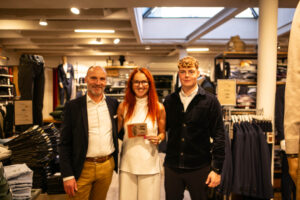 “Jeg er ikke særligt teknisk, men det lykkedes at printe gavekortet”, sagde Brian Schlott og fik sin medarbejder, Henrik Winston og butikkens elev til at give kortet til Lena Krag Schmidt.