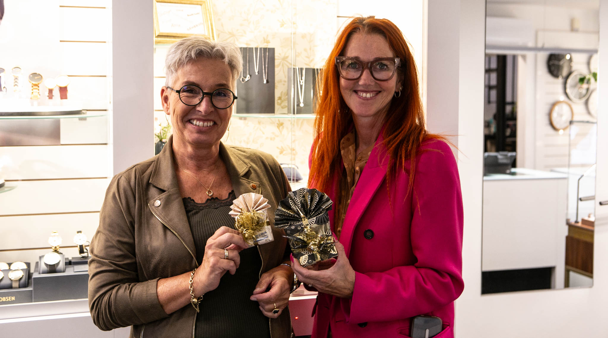 “Du gør det godt og det er en god sag”, sagde Bjarne Vejsnæs og fik sin medarbejder, Bærbel Laursen, til at give smykkerne til Lena Krag Schmidt.