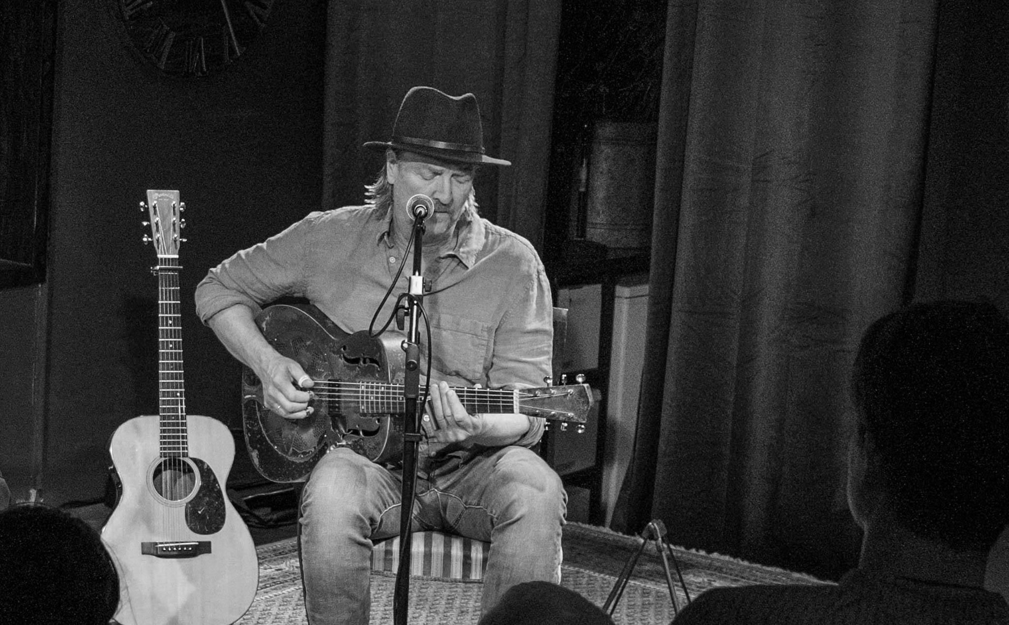 Med sig på scenen har han sit mix af sange, han selv har skrevet og gamle sange fra den amerikanske folkemusik tradition. Og selvfølgelig sine guitarer og sin banjo.