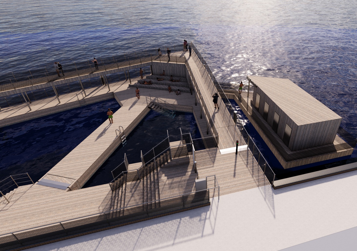 Den nye ponton forbindes til havnebadet via en flydende bro, og det samlede design vil harmonere med havnebadets eksisterende arkitektur, hvilket sikrer en indbydende og sammenhængende oplevelse for alle besøgende.