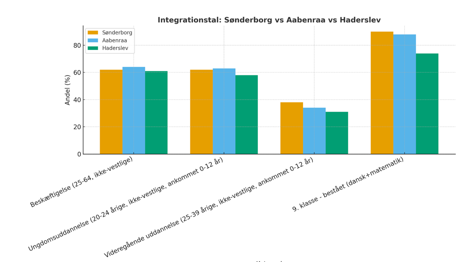 I SF vælger vi en anden statistik, der efter vores mening tegner et mere sandt billede af virkeligheden i integrationsindsatsen. Sønderborg ligger på niveau med Åbenrå på en række vigtige områder, men langt bedre end Haderslev.