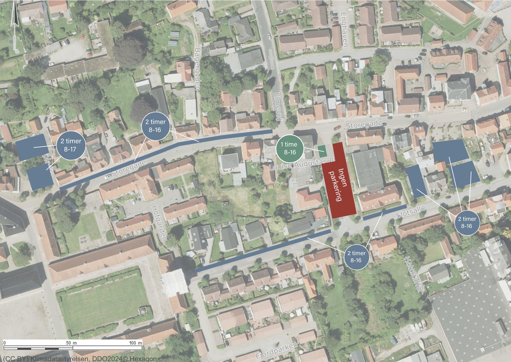 Slotsallé samt øvrige offentlige p-pladser med indkørsel fra gaden: 2 timer kl. 8-16