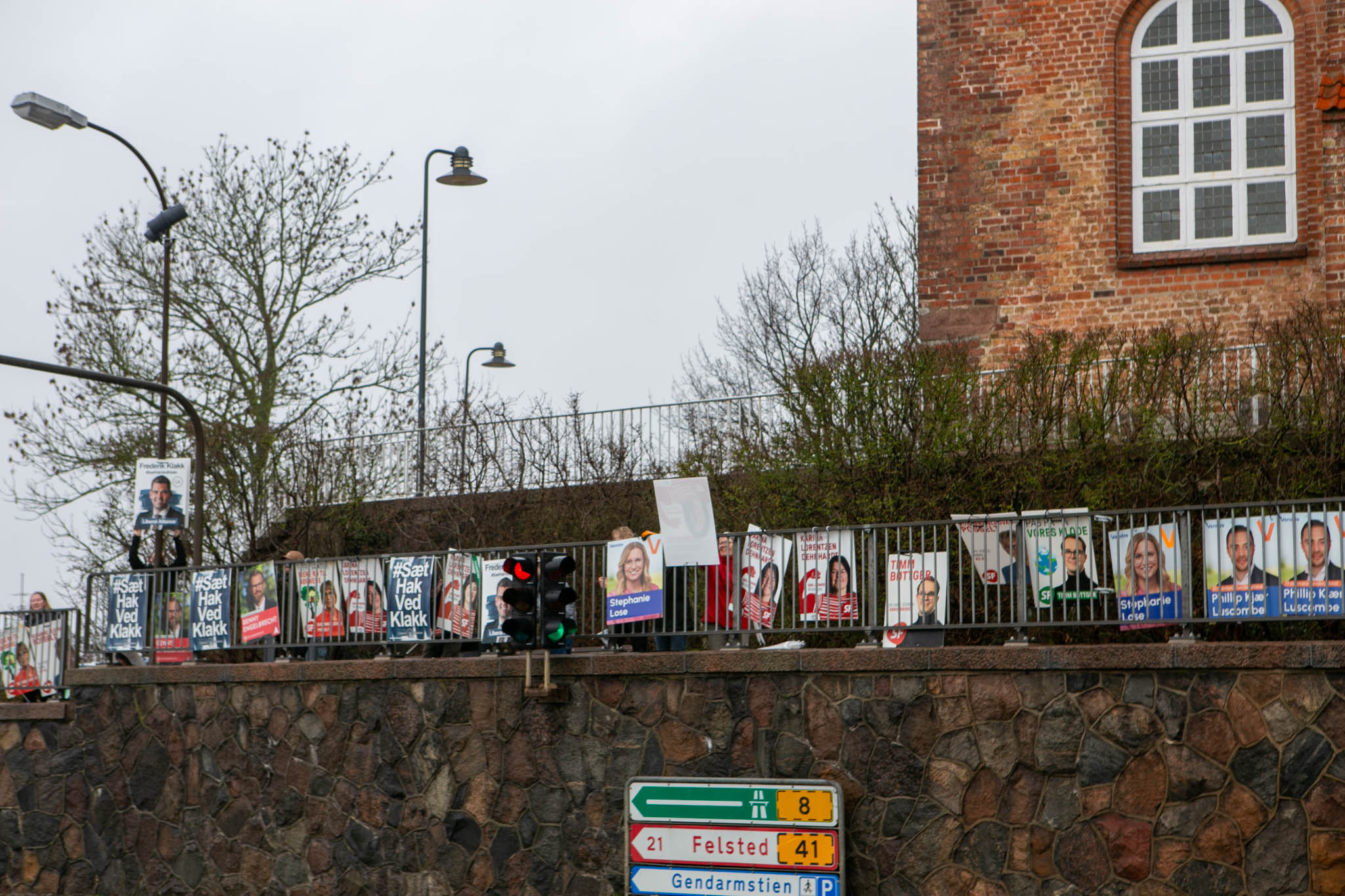 Lørdag blev der hængt et væld af valgplakater op og en af de mange regler, som der for plakaterne, det er, at de skal hænge mindst 2,30 meter over fortove og lignende, så cyklister og fodgængere frit kan passere.