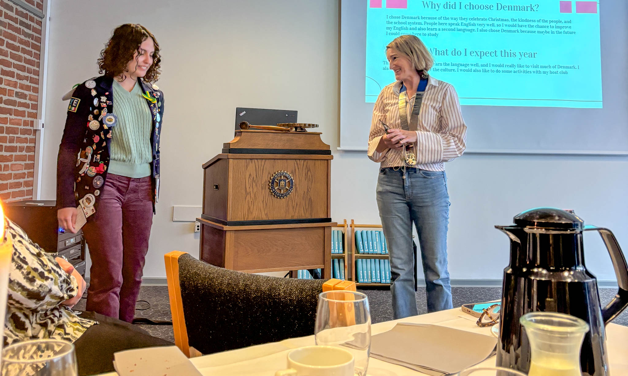 Gaia, som er udvekslingsstudent i Danmark, mødte også op i sin flotte Rotary-jakke og præsenterede sig først på dansk, inden hun fortsatte på engelsk.