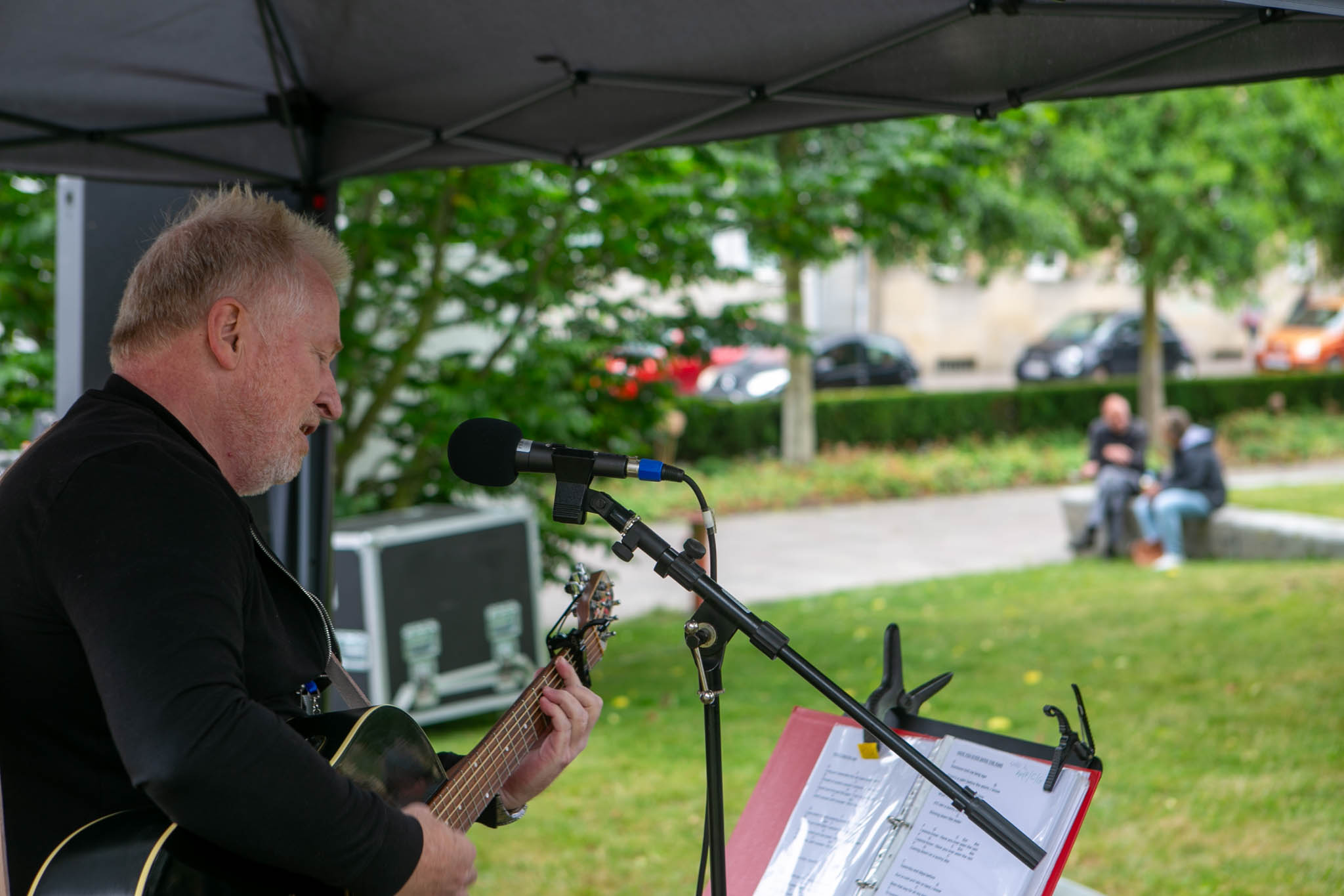 Lørdag eftermiddag havde Martin Michael Jakobsen, Carina Sanddahl og en stor gruppe frivillige sat scenen til Sjov & Musik i Apotekerhaven og trods det at vejret ikke helt var med dem, så havde de et publikum.