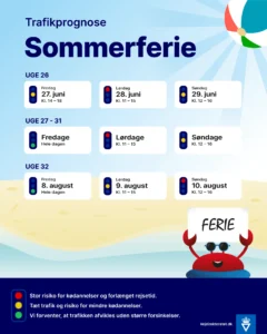 Når skoleklokkerne ringer ud for sidste gang inden ferien, og danskerne pakker bilen for at drage mod sommerhus, strand og sydlige himmelstrøg, er der også udsigt til nogle af årets travleste dage på de danske veje. Vejdirektoratet anbefaler derfor, at man planlægger sin rejse i god tid, og at man så vidt muligt kører uden for de mest trafikerede tidsrum.