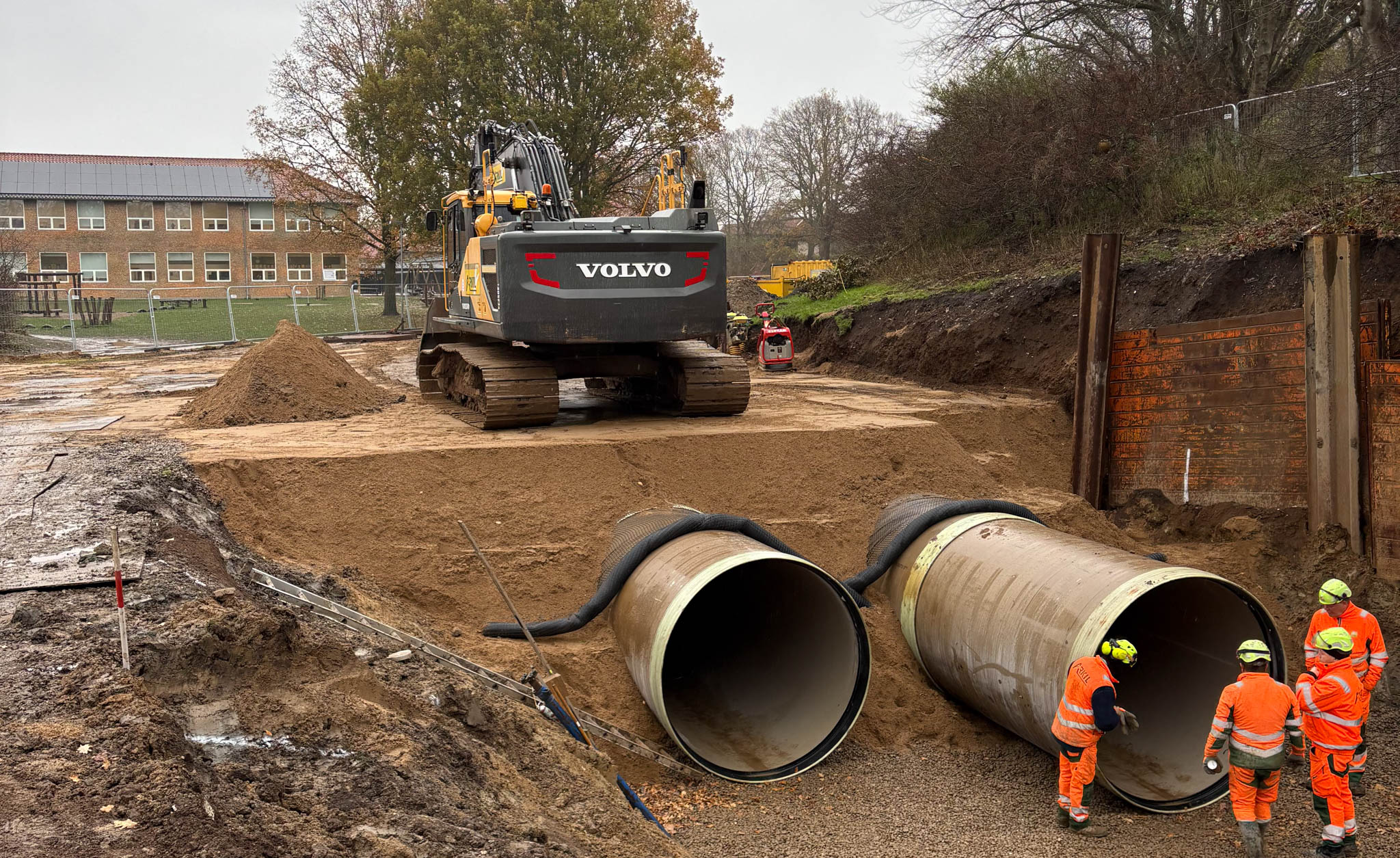 Siden slutningen af oktober har skolebørnene på Sønderskov-Skolen kunnet se store gravemaskiner æde sig gennem et afspærret område af deres legeplads. Her har Arkil nemlig været i gang med at anlægge to store rørbassiner for SONFOR.