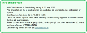 Kids Tour handler om bevægelsesglæde, trafiksikkerhed og masser af grin, og hele familien er inviteret med, skriver arrangørerne og Sønderborg Kommune er igen med som lokal partner og inviterer til en cykeldag, hvor hele familien kan være med. For kun 50 kroner får hvert barn et startnummer, en medalje og en goodiebag – og på eventpladsen venter der gratis aktiviteter, konkurrencer og smagsprøver for både store og små.