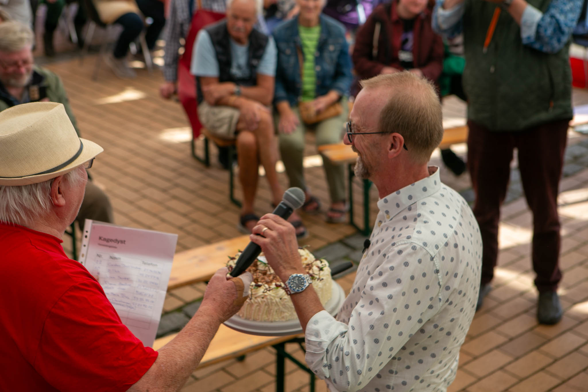 “Vinderen blev Carmen Christensen, der med hjælp fra Eva Johansen, havde lavet en kage med æble og flødeskum. Den har en rigtig god smag og den er flot udført”, sagde de to dommere. Uheldigvis var de to kvinder taget hjem.