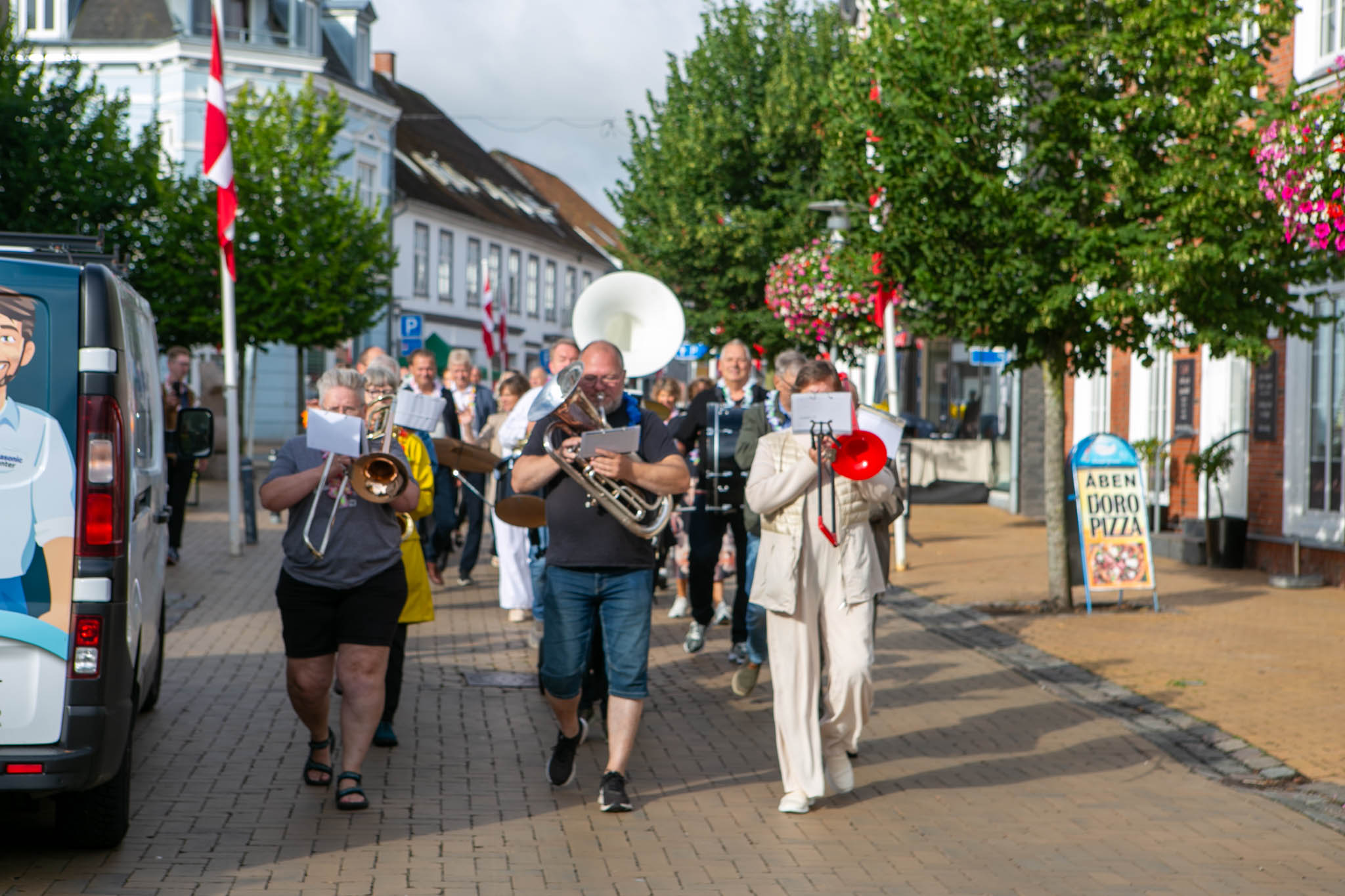 Fredag morgen gik Broager Brandværnsorkester gennem Gråstens gader og med i optoget var medlemmer af handelsstandsforeningen og borgmester Erik Lauritzen.