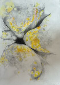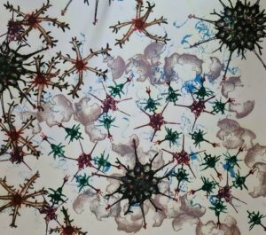 Karen Bjerresgaard – inspireret af for – og nutidens naturformer og udforsker det surrealistiske mikro/makro-landskab i tryk/mix media.