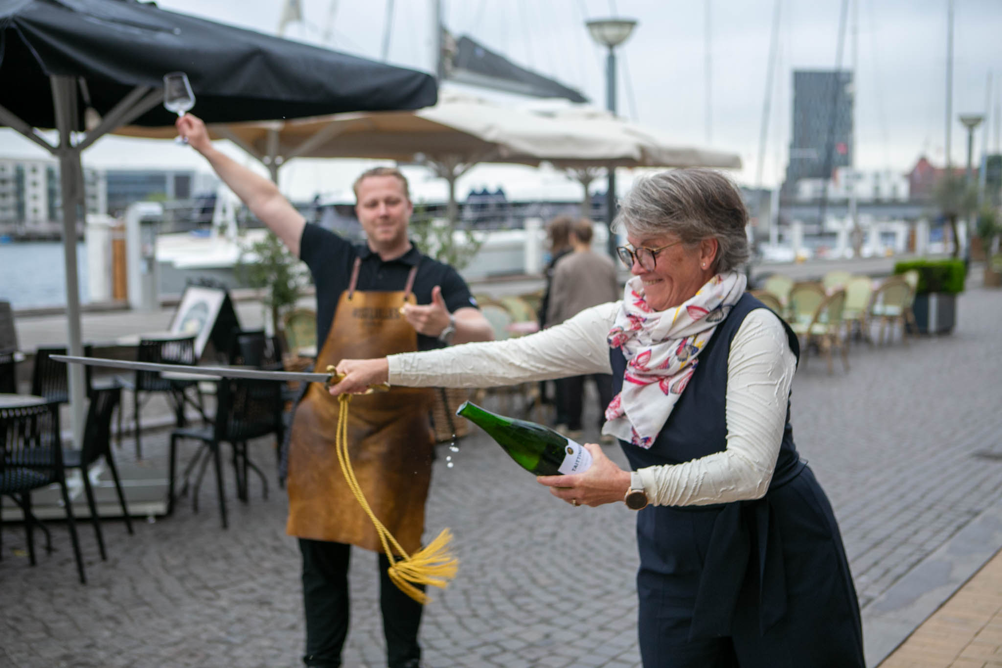 Fredag aften var formanden for Teknik, By og Boligudvalget, Kirsten Bachmann, på Visselulle Vinbar, hvor hun fik lov til – for første gang – at sable en flaske champagne, som hun selv havde købt og dele den med venner, hun havde taget med til havnen. Anledningen var, at lukningen af Sønder Havnegade skulle fejres.