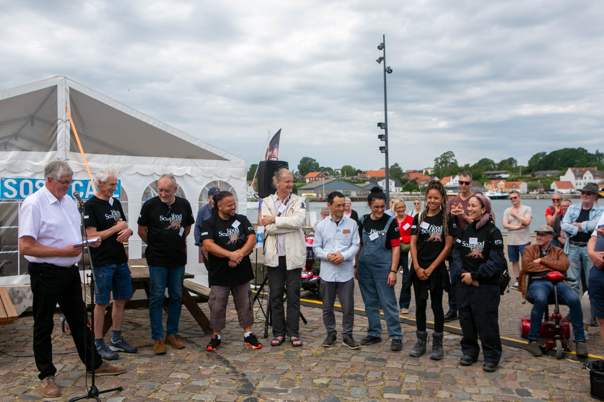 De otte kunstnere, som er med i WoodSculpture på Slotskajen kommer fra forskellige steder i verden og borgmesteren havde succes med at udtale navnene på hver enkelt af dem og da de var præsenteres blev savene startet og arbejdet med at forvandle træstammer til skulpturer gik i gang.
